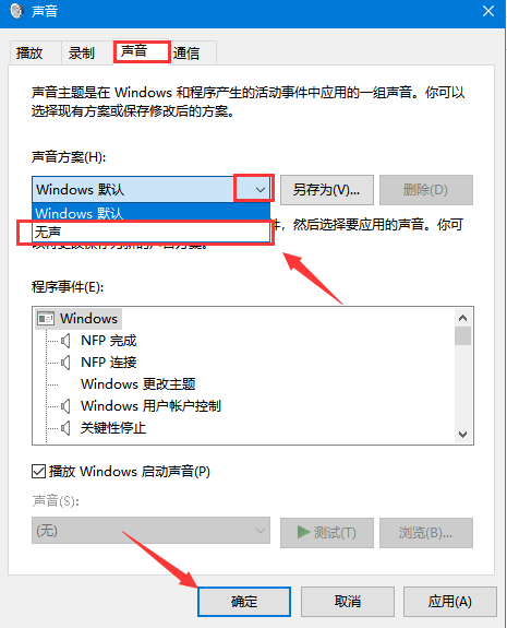 6.在弹出的界面,把声音方案改成无声,再点击确定